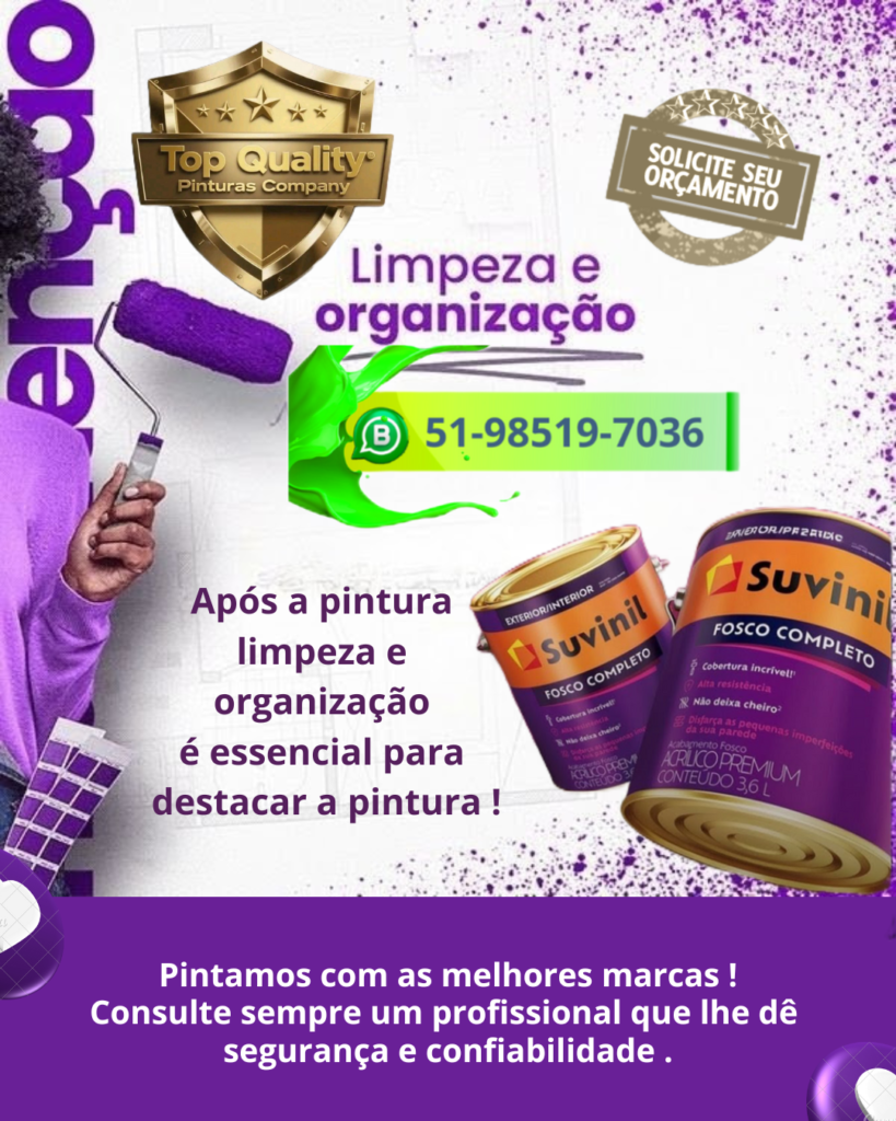 Nossa filosofia de trabalho: Com experiência desde 1992 na área de pintura predial, oferecemos mais do que um serviço: entregamos confiança, qualidade e compromisso. Atuamos com foco total na segurança, durabilidade e acabamento impecável, seja em obras residenciais ou comerciais. Cada projeto é tratado com seriedade e atenção aos detalhes, desde o planejamento até a finalização. Trabalhamos com materiais de alta performance, técnicas modernas e profissionais qualificados, garantindo um resultado que valoriza e protege o seu patrimônio. Acreditamos que um bom serviço vai além da pintura: é sobre cumprir prazos, respeitar o cliente e entregar o melhor sempre.